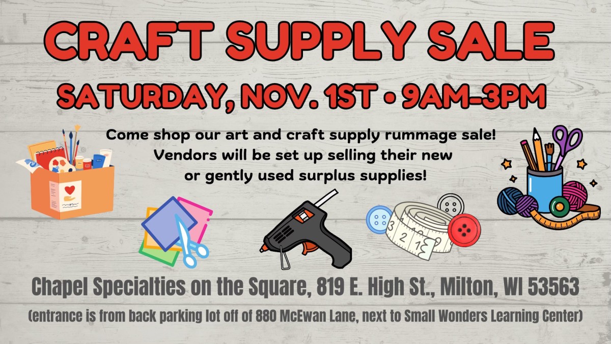 This craft supply sale will be held in the upper level at Chapel Specialties building. Several vendors will have tables set up selling their gently used and new art and craft supplies. Items for sale include fabric, cross-stitch items, miscellaneous sewing supplies, yarn, crocheting & knitting items, beads, Scrapbooking items such as card stock, patterned papers, embellishments, ribbons, stickers, etc. Glitter, Rhinestones, Epoxy Molds, Heat Press, Cup Press, Creative Memories punches, completed scrapbook pages, Simple Page Kits, card making, paper, envelopes, embellishments, storage items, cross stitch books and kits, and more, AngelMoon Creations in Suite #4 and B's Place in the big chapel room will be open as well, selling crafting supplies and more.