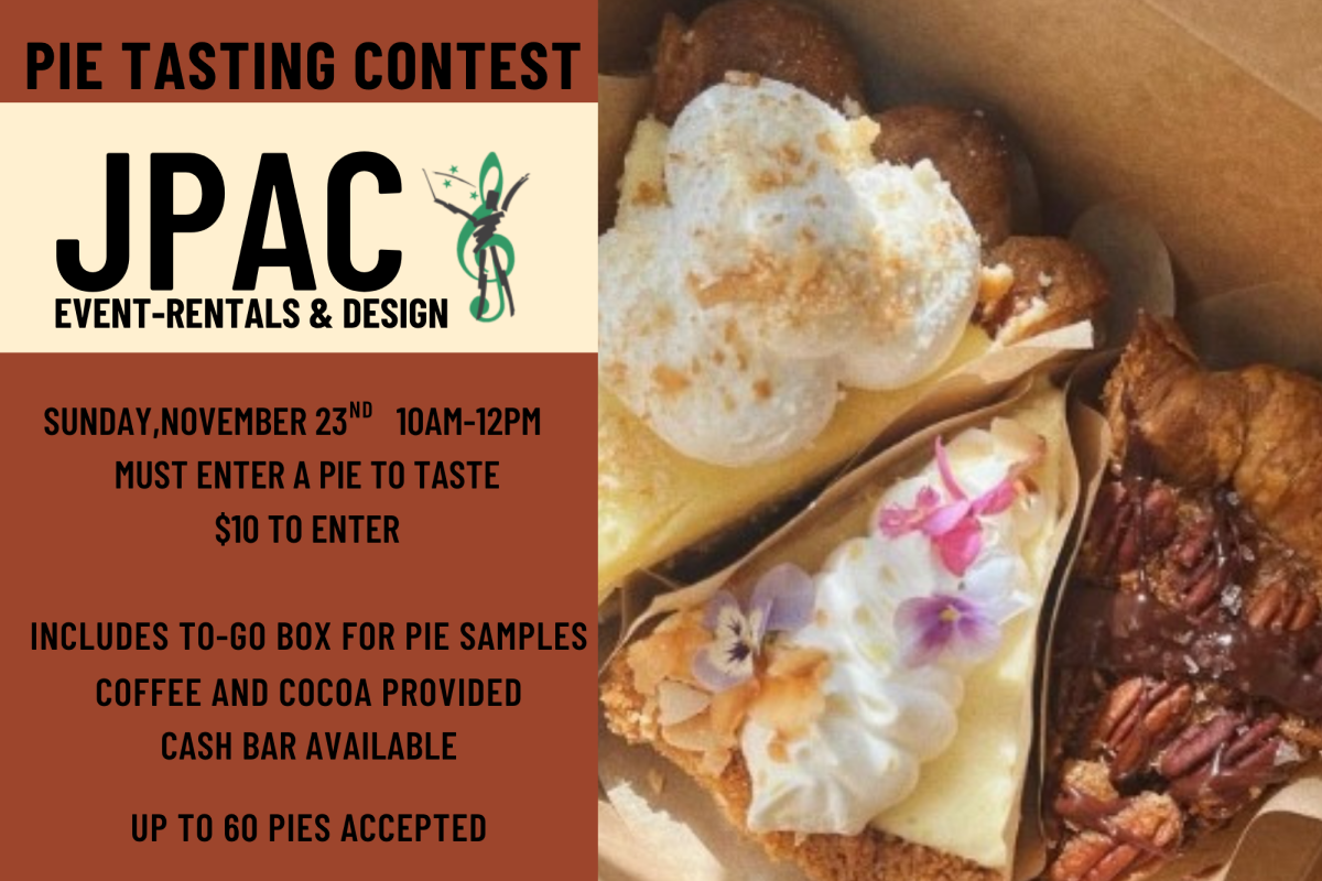 The JPAC Events, Rental & Design Team invites you to this pie tasting event, where you must enter a pie to participate. Up to 60 pies will be accepted, and there will be to-go boxes for pie samples, coffee, hot cocoa and a cash bar for hot toddies. Prizes will be awarded for first, second, and third top voted pies.