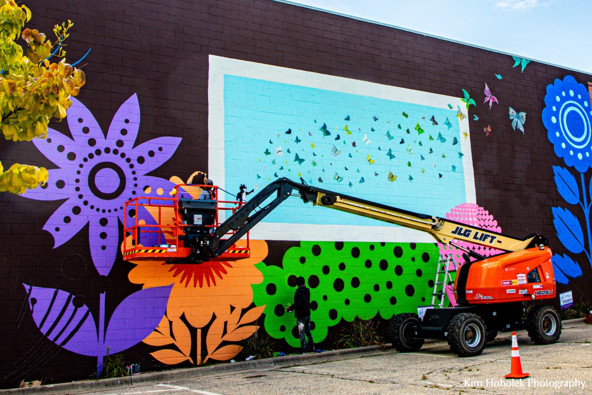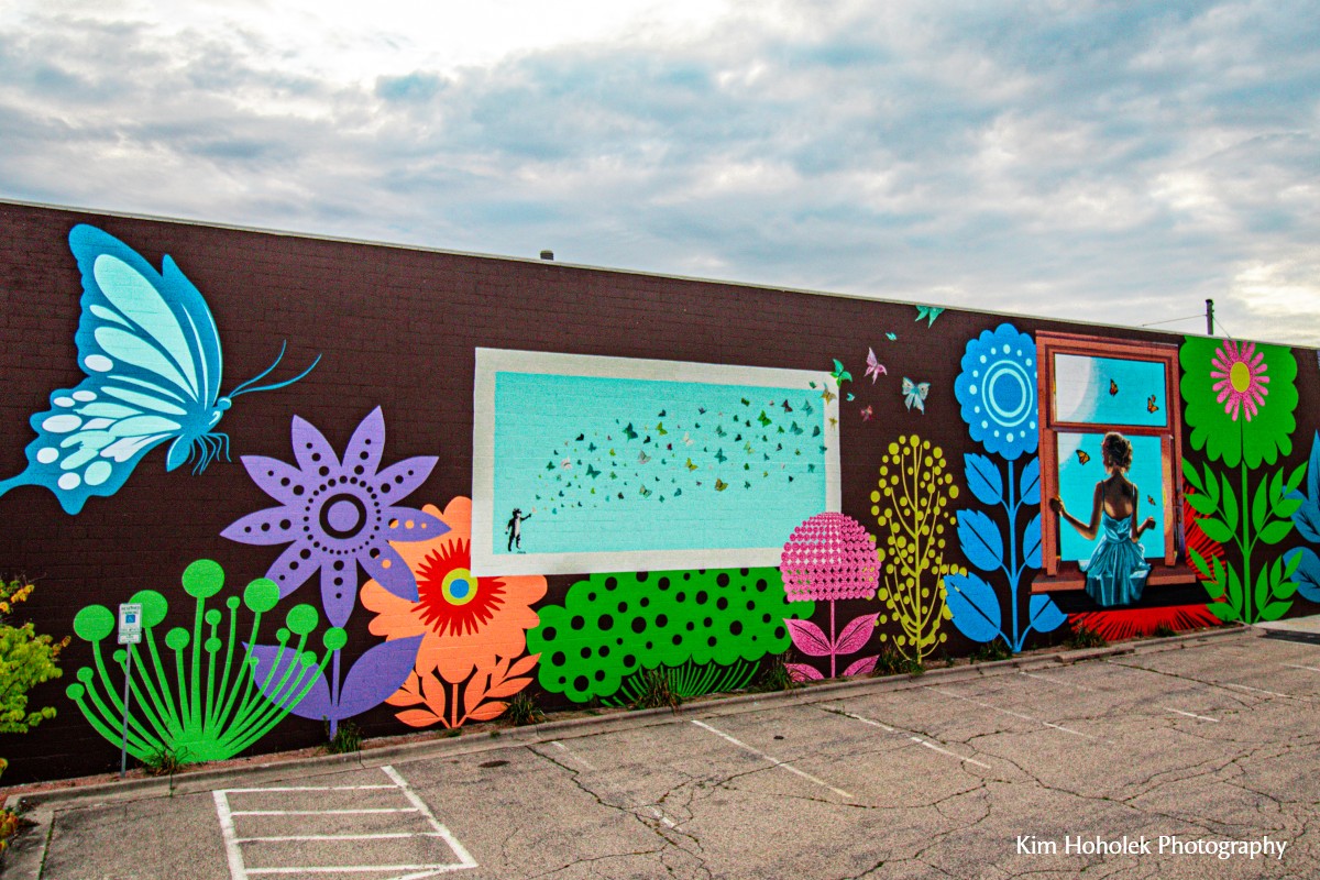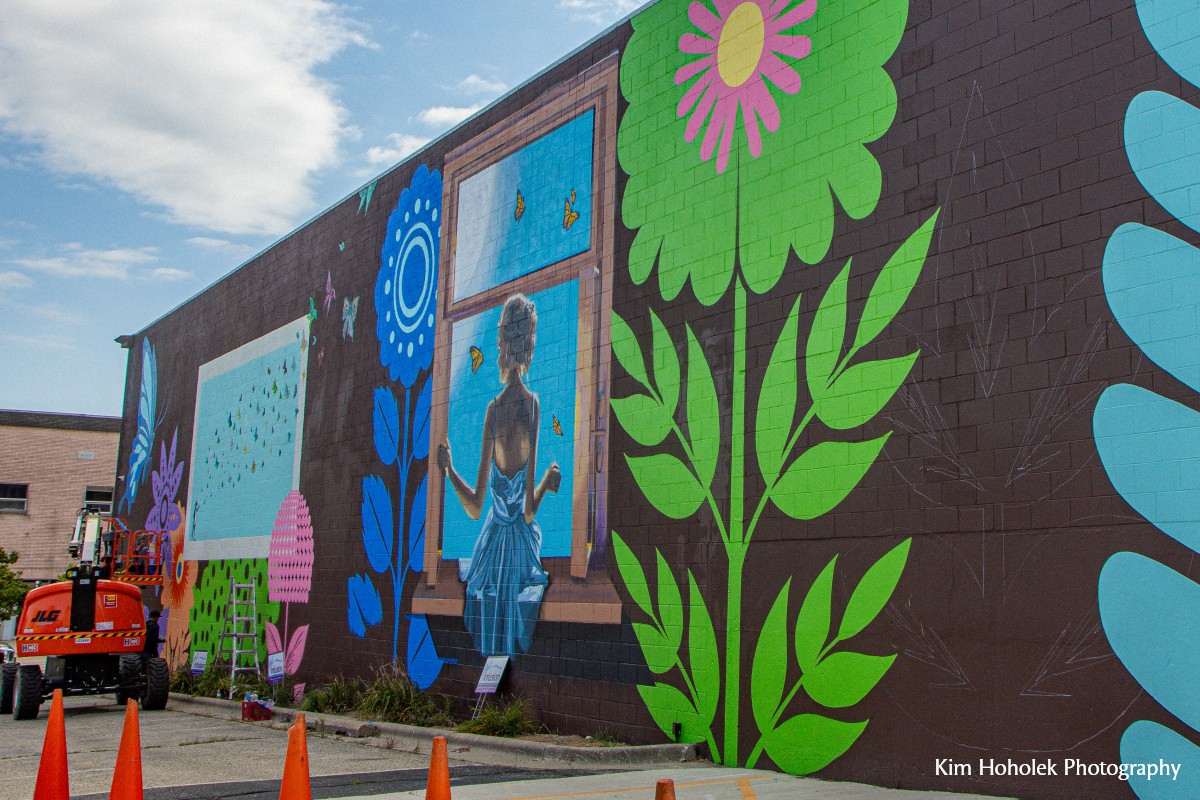 Painted during Art Infusion 2025 by Chris Silva of South Bend, Indiana, this mural ties together two existing murals (Phoebe's Dream and Window Seat) into one cohesive whole. Chris came up with this oversized pollinator garden as an environment for the pieces to exist within. Chris also painted the Rock River Guardian mural during Art Infusion 2022.